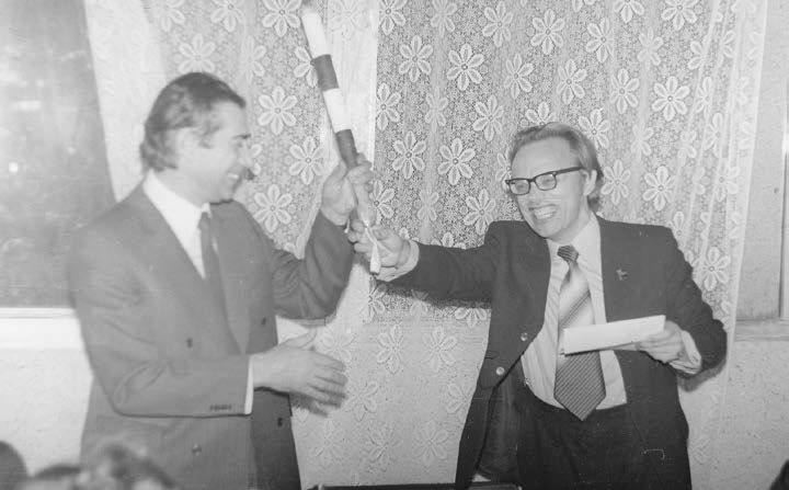 ![]() И. Н. Тодоров и Г.Н. Богданов, 1975 г. Вручение «руководящего» жезла по случаю создания лаборатории молекулярной генетики. |