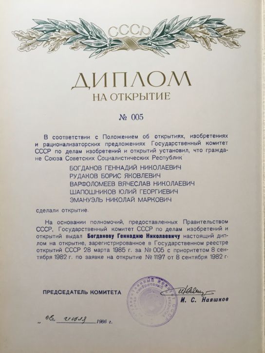 | Диплом на открытие №005, Богданов Г.Н., Рудаков Б.Я., Варфоломеев В.Н., Шапошников Ю.Г., Эмануэль Н.М., зарегистрировано в Госреестре открытий СССР 28 марта 1985 г. за № 005 с приоритетом 8 сентября 1982 г. по заявке на открытие №1197 от 8 сентября 1982 г. | Обложка монографии Ю.Г. Шапошников, Г.Н. Богданов, В.Н. Варфоломеев, Н.И. Нешев, И.А. Максимова «Огнестрельная рана. Физико-химические и медико-биологические аспекты». М.: Наука, 2002 г. |