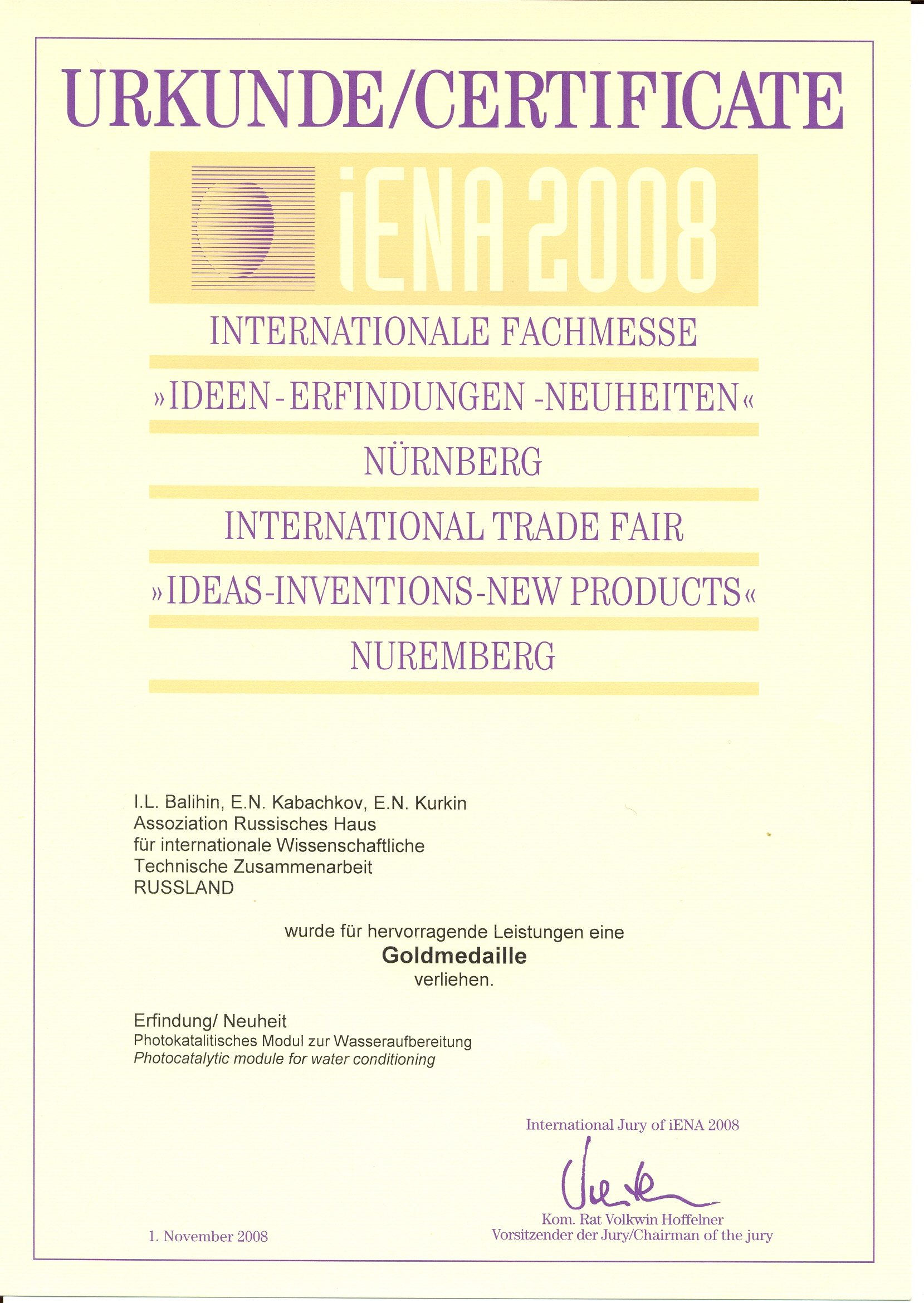 Award: Goldmedaille Internationale fachmesse "ideen-erfindungen-neuheiten" Nurnberg International trade fair "ideas-inventions-new prodicts" Nuremberg Photocatalytic module for water conditioning |
