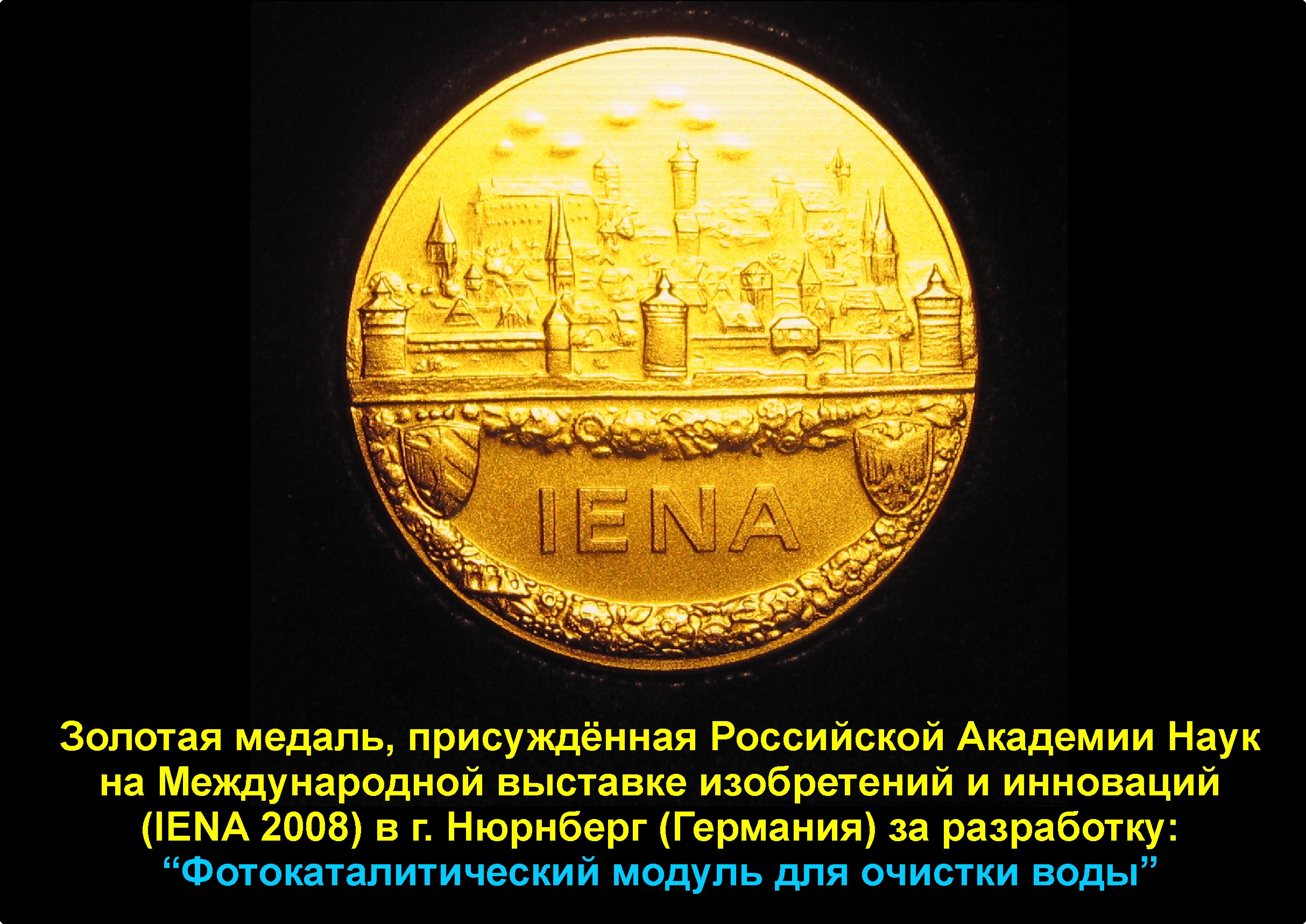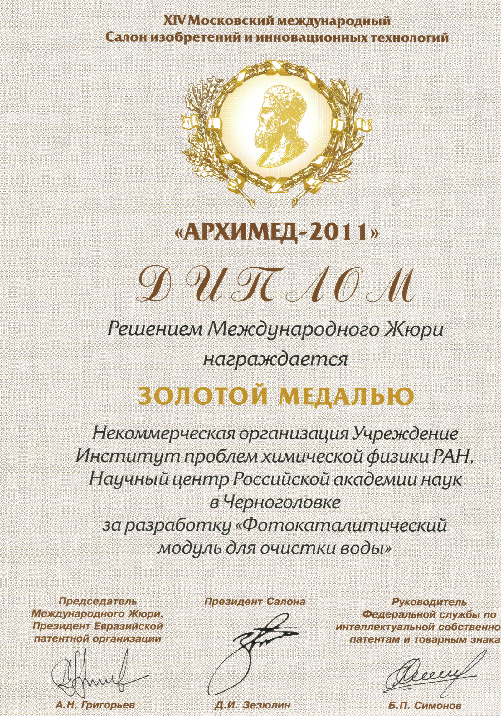 Award: Gold medal at the XIV International Salon of Inventions and Innovative Technologies "Archimedes-2011" for the development of "Photocatalytic module for water purification". |
