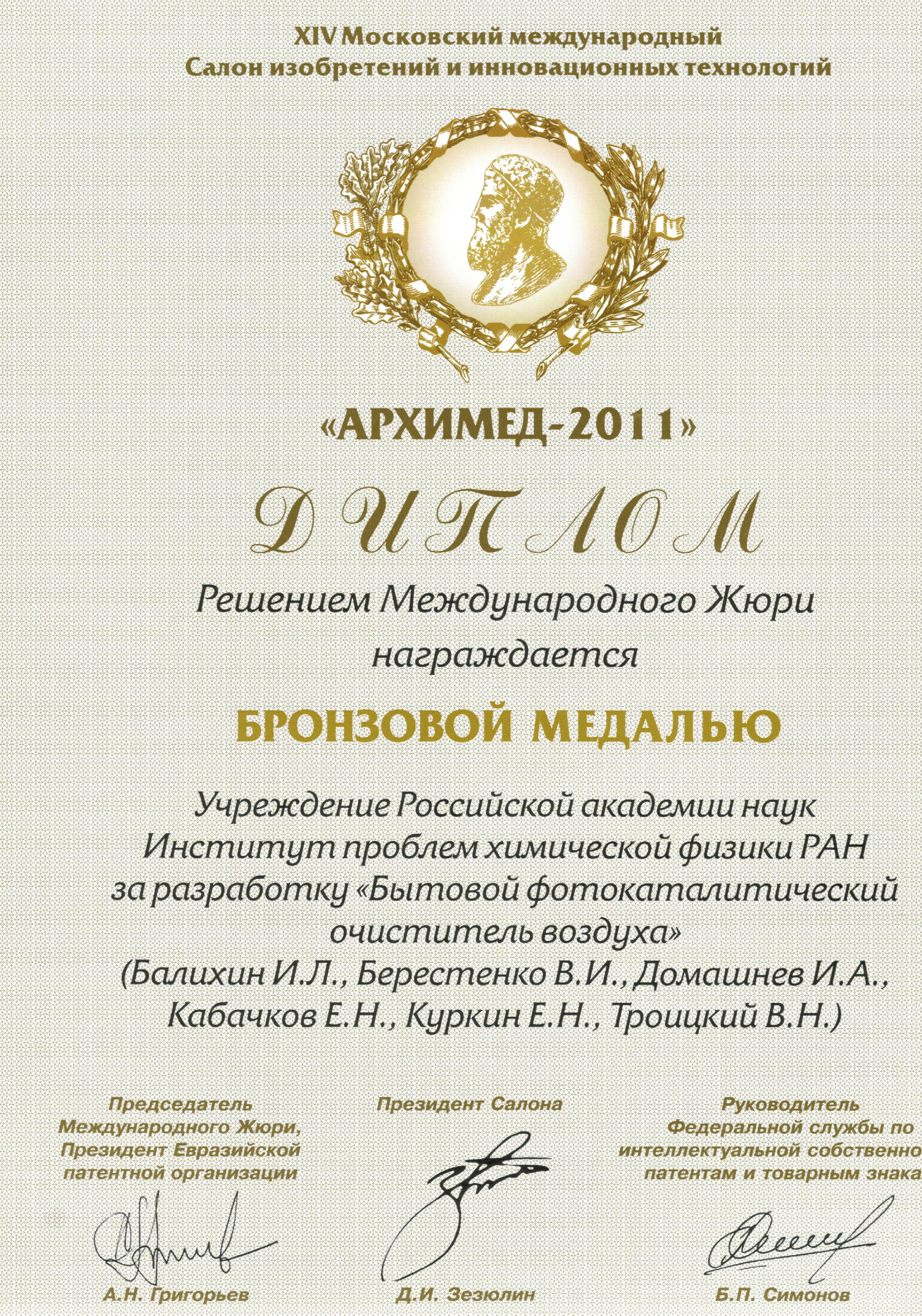 Award: Bronze medal at the XIV International Salon of Inventions and Innovative Technologies "Archimedes-2011" for the development of "Household photocatalytic air purifier". |